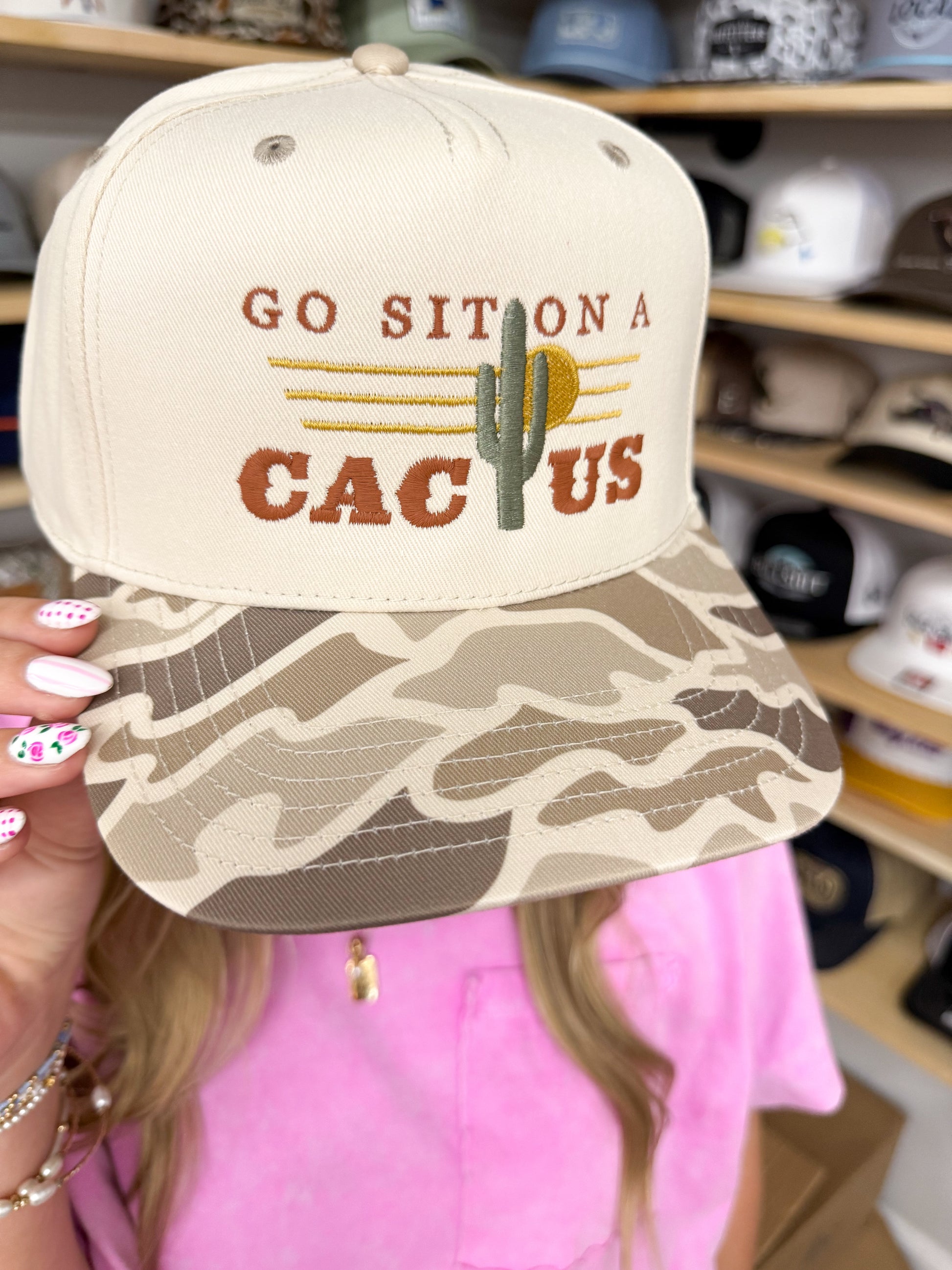 Go Sit On A Cactus Trucker Hat: Retro Field Camo/ Natural