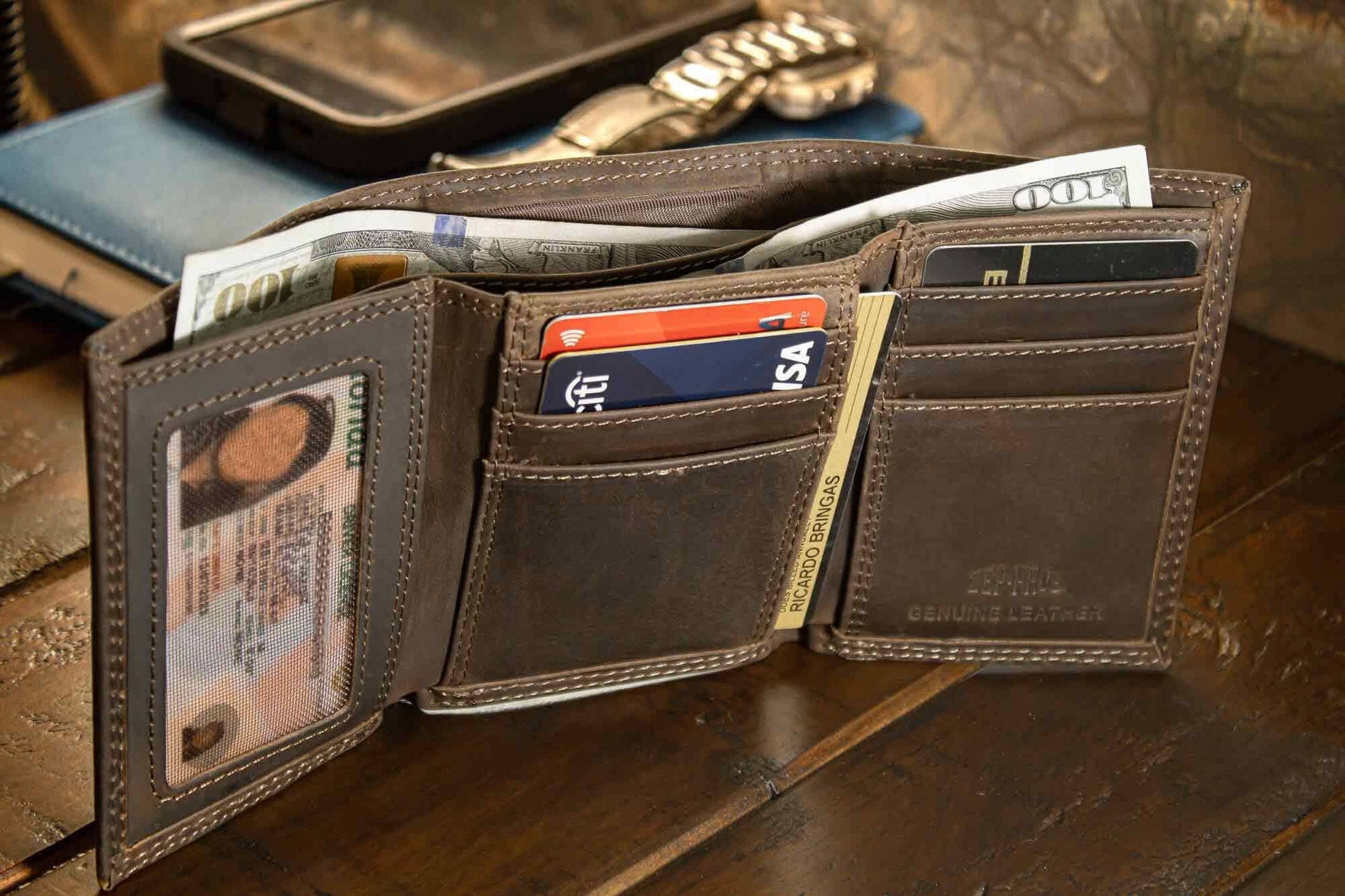 The trifold design provides ample space for cards, ID, and cash, while the leather gives it a natural appearance. Additionally, the combination of the design, along with the rich texture of genuine leather, creates a visually captivating item. It combines visual aesthetics, elegance, craftmanship, durability, and the opportunity for self-expression in a single accessory. This wallet represents not only a functional item but also a connection to nature.