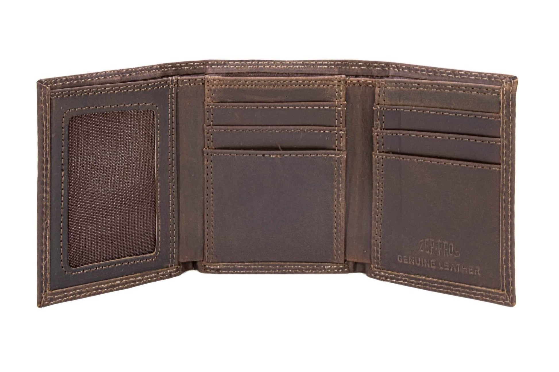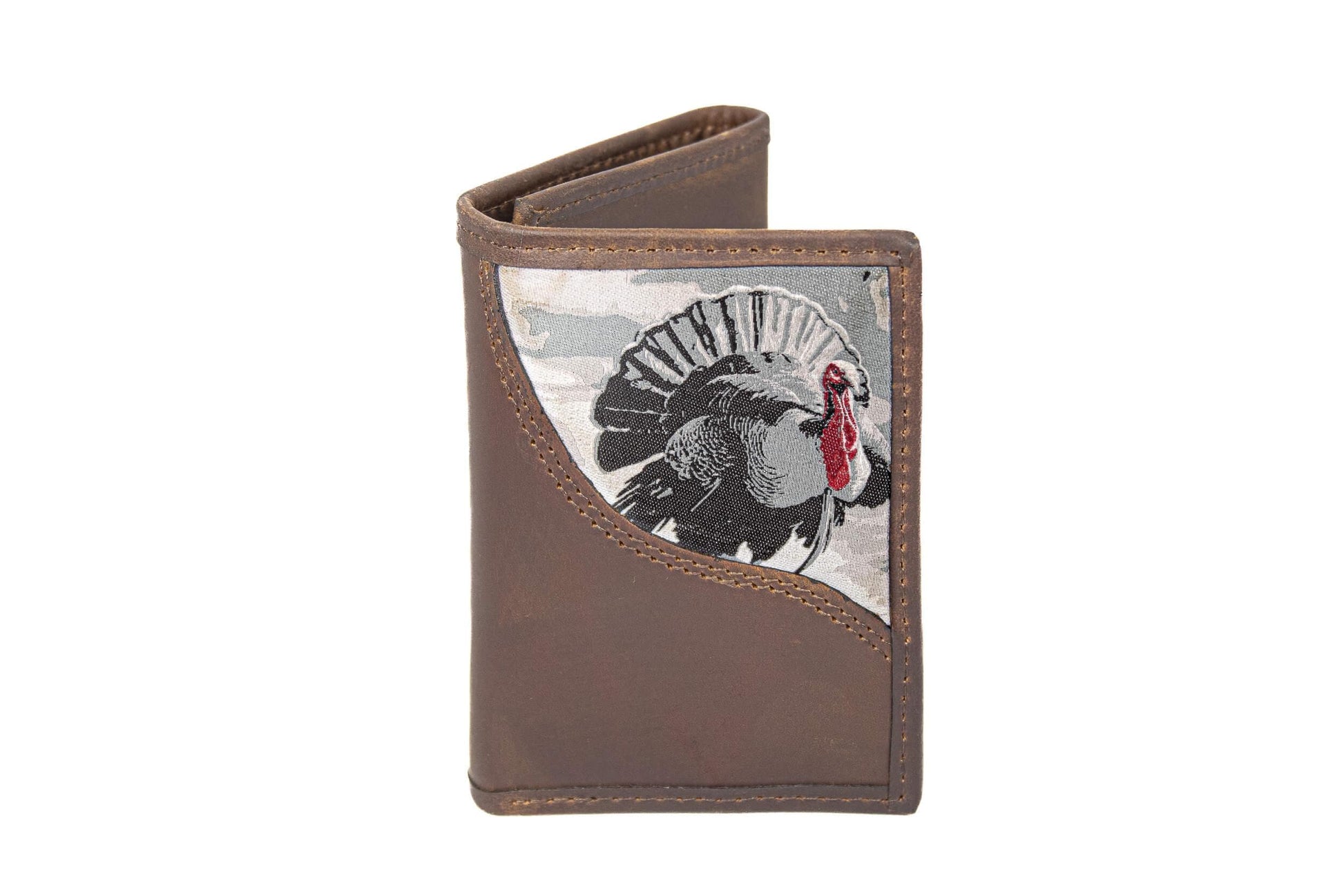 Show your passion with an original Zep-Pro leather trifold wallet featuring a Woven Patch - Turkey design. The wild bird imagery on these wallets taps into our intrinsic connection to nature and wildlife. It is a stylish and unique way to show enthusiasm while keeping important cards and cash organized. This Zep-Pro wallet is constructed of full grain leather with a sewn in woven patch Turkey design.
